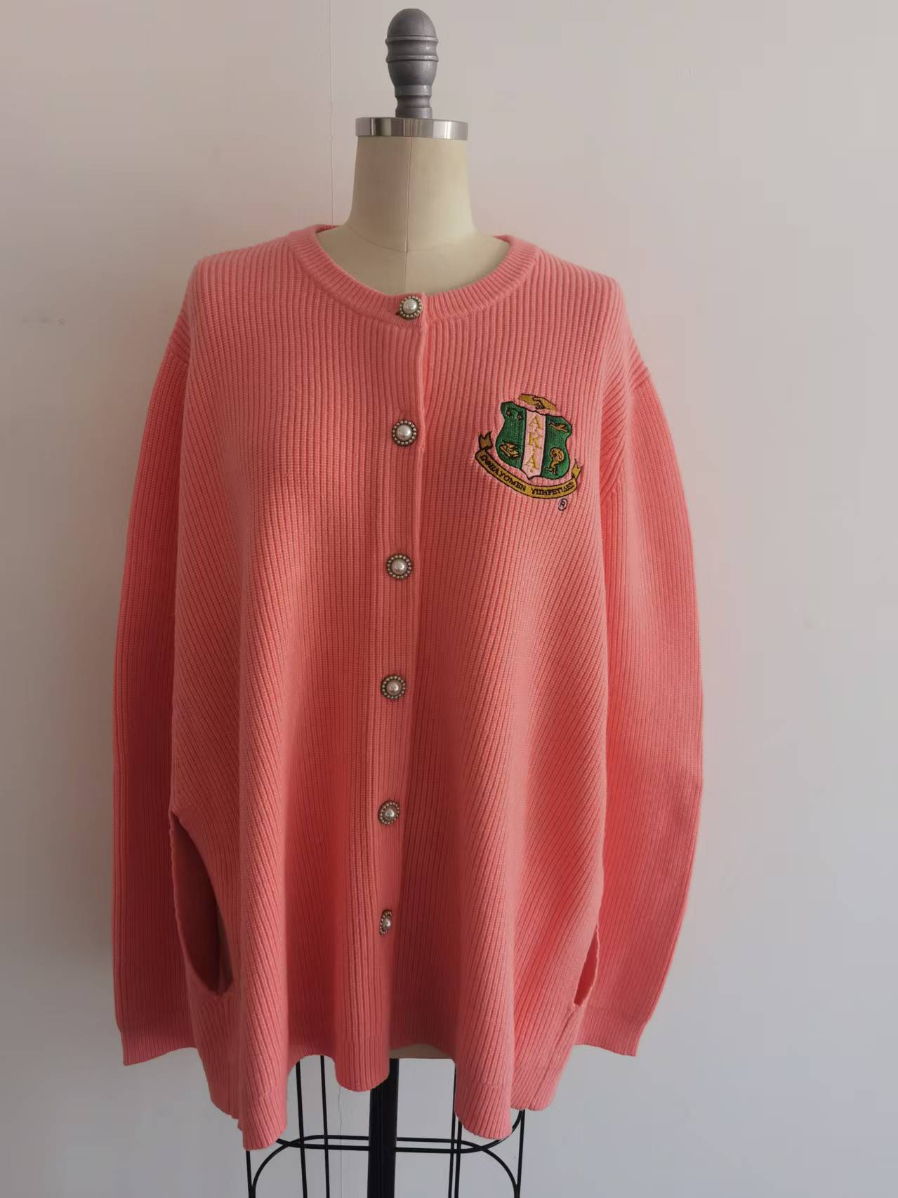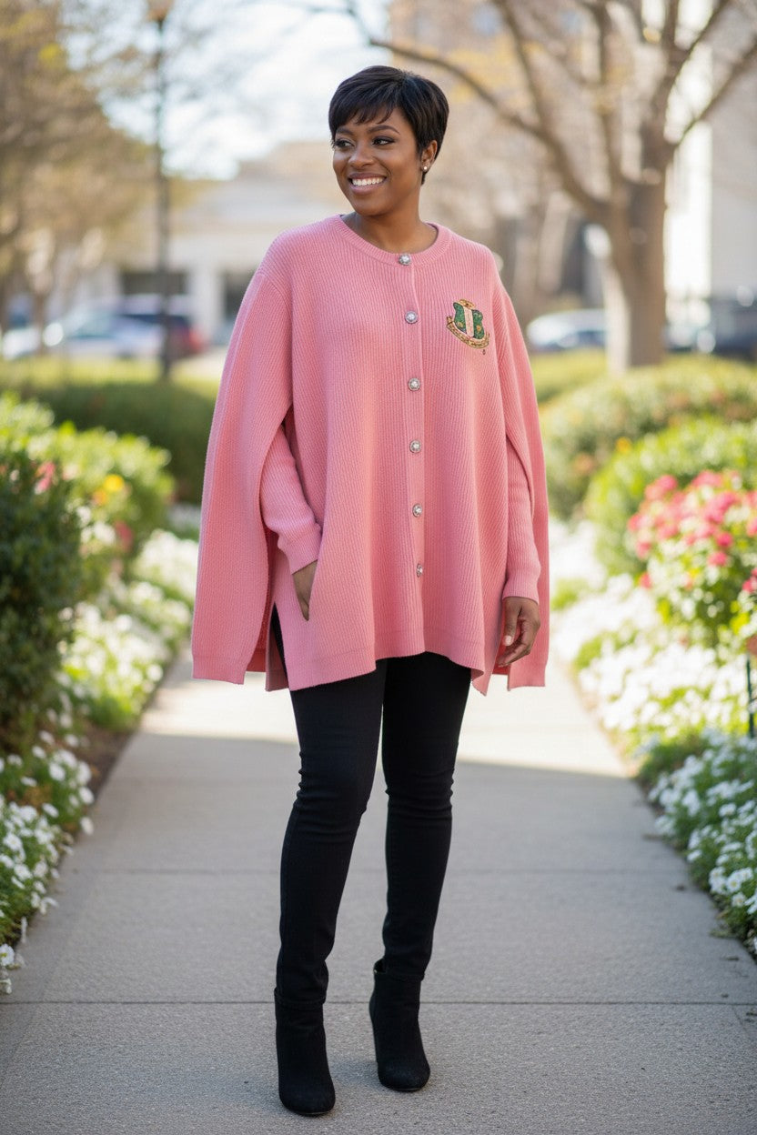Elegant knit cape in a soft salmon pink hue, perfect for adding sophistication to any outfit. Features an embroidered AKA shield on the left chest, showcasing your pride and affiliation. The pearl button-down closure provides a polished, tailored look while allowing easy layering over dresses, blouses, or sweaters.