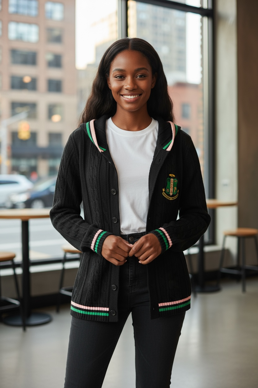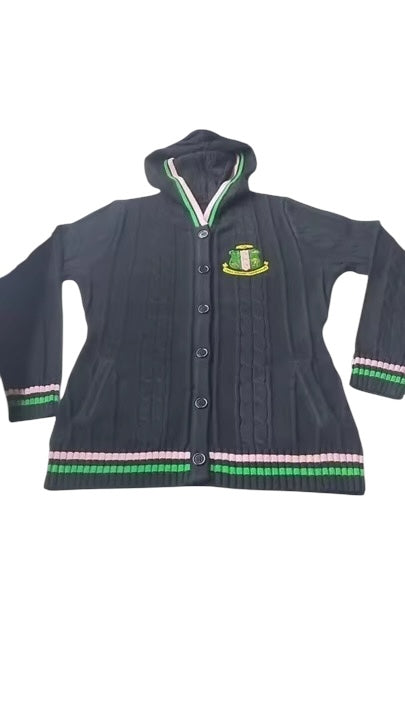 This expertly crafted cable knit sweater features a button-down front and an attached hood for versatile wear. Its classic black base is accented with subtle pink and green trim along the hood and hem, adding a refined touch of color. Designed to provide warmth and style, this sweater is an ideal choice for layering in cooler weather while maintaining a polished look.