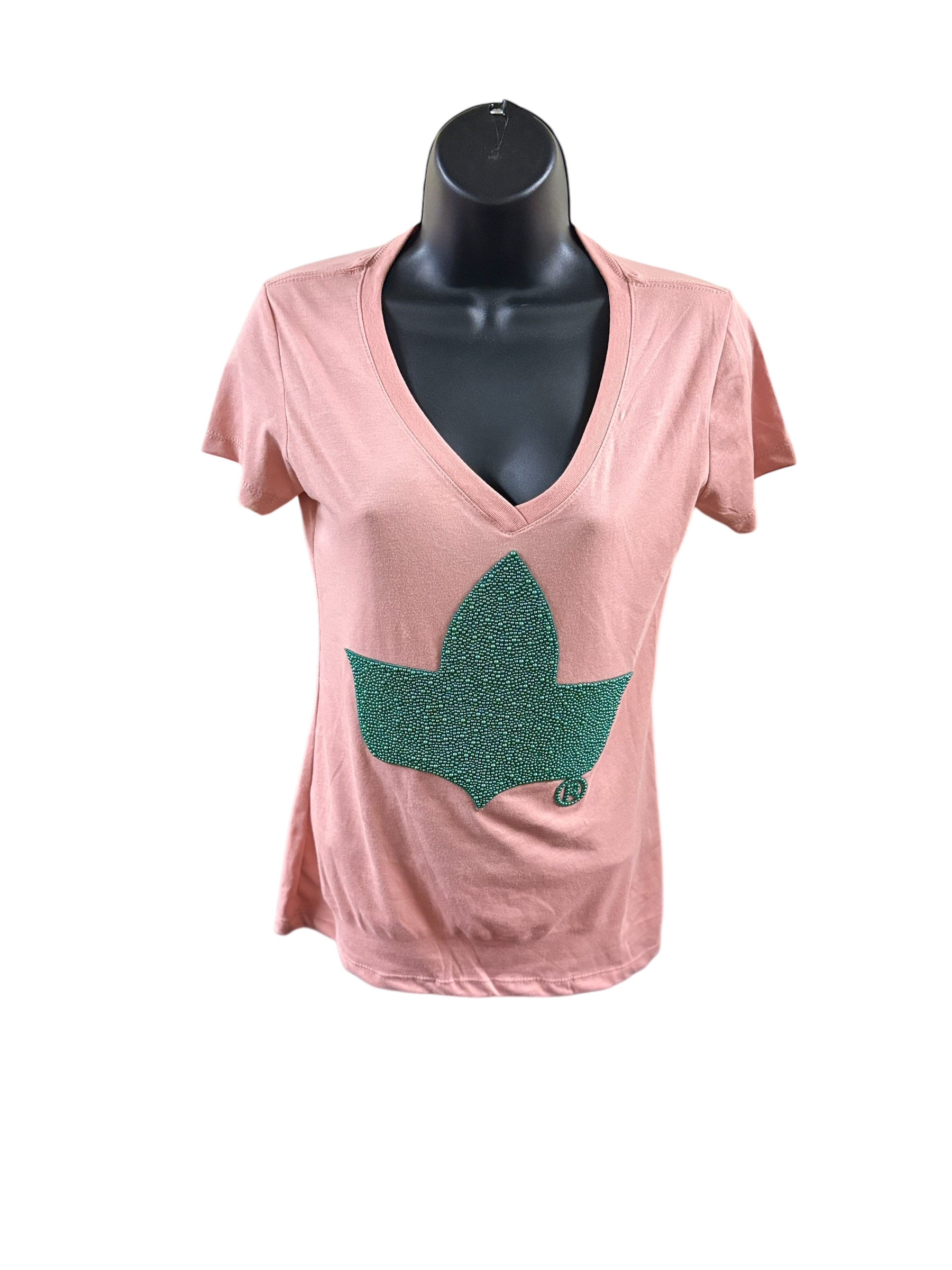 Dusty Rose V Neck T Shirt with Green Ivy Pearl